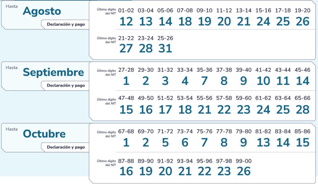 Si tu NIT es 123456701-0, debes tomar únicamente el 01 para consultar la fecha. La fecha de vencimiento sería el 12 de agosto de 2026.