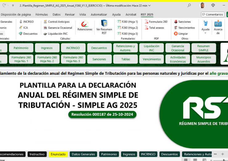 Régimen simple de tributación gestionado de forma eficiente mediante una herramienta en Excel con diseño inteligente y fácil manejo, que permite al usuario ahorrar tiempo, reducir errores y realizar de manera práctica y eficiente el diligenciamiento de la declaración anual del impuesto SIMPLE vigencia 2025.